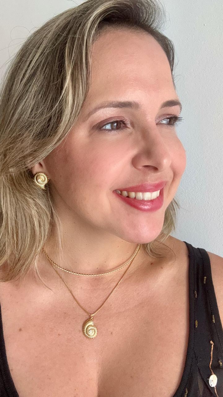 Banhado a ouro 18k, possui acabamento refinado e brilho sutil que valoriza o desenho orgânico da concha. Com peso aproximado de 4g, é confortável e ideal para uso diário, trazendo frescor e sofisticação às produções.