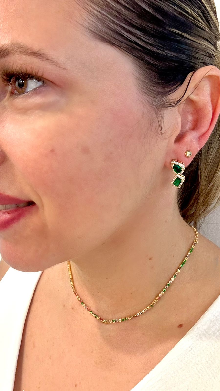Com zircônias vibrantes e acabamento em Ouro 18K, ele transforma qualquer roupa. É ultraleve (4g) e tem o brilho de diamante.