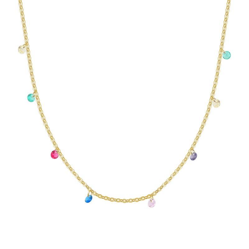 O Colar Longo com Cristais Coloridos de 61cm é a peça ideal para dar profundidade e alegria ao seu decote. Os cristais espalhados adicionam um toque de cor sofisticado, e o banho em Ouro 18K garante o brilho que valoriza suas outras joias.