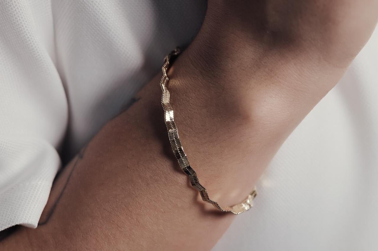 Para quem ama um visual moderno e sofisticado, a Pulseira Malha Fita Curvada é essencial.