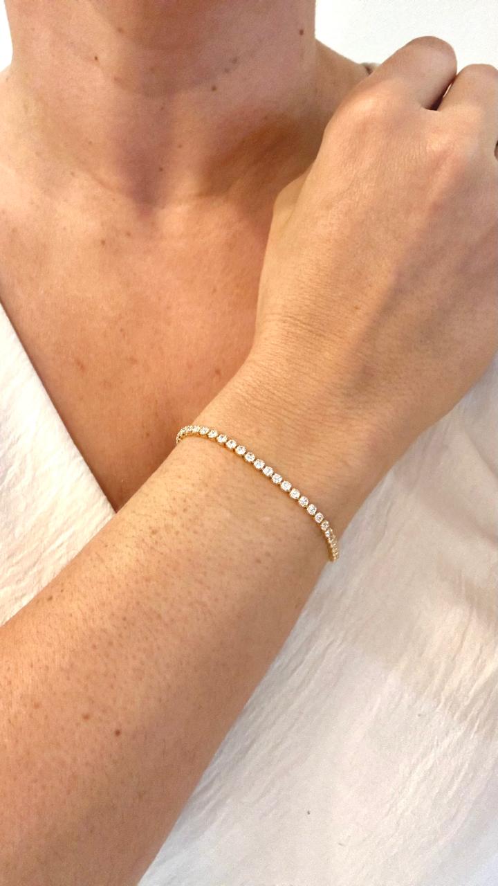 A Pulseira Riviera Clássica é o auge da sofisticação, apresentando zircônias cravejadas em linha contínua que garantem um brilho idêntico ao de diamantes. Banhada em Ouro 18K, ela é o toque de luxo discreto que funciona 24 horas por dia.